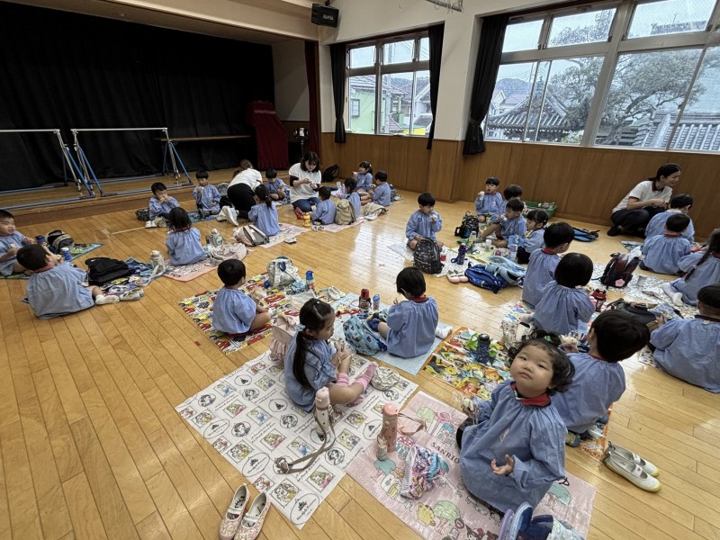 そのあとは、芝生広場で体を動かしたり、保育園に戻ってレジャーシートを敷いておにぎりを食べたり…室内でも遠足ごっこを楽しみました!!
