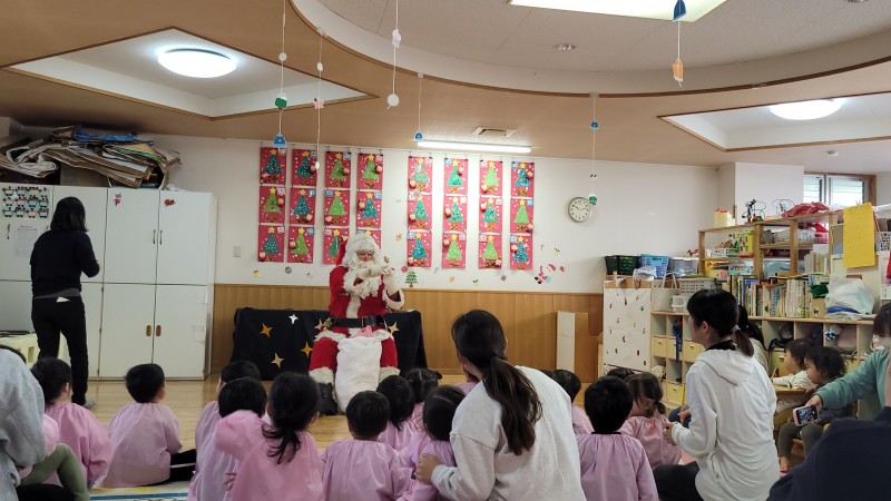 待ちに待ったクリスマス会。サンタさんと一緒に歌やダンスを楽しんだり職員からの出し物に目を輝かせながら参加していました。